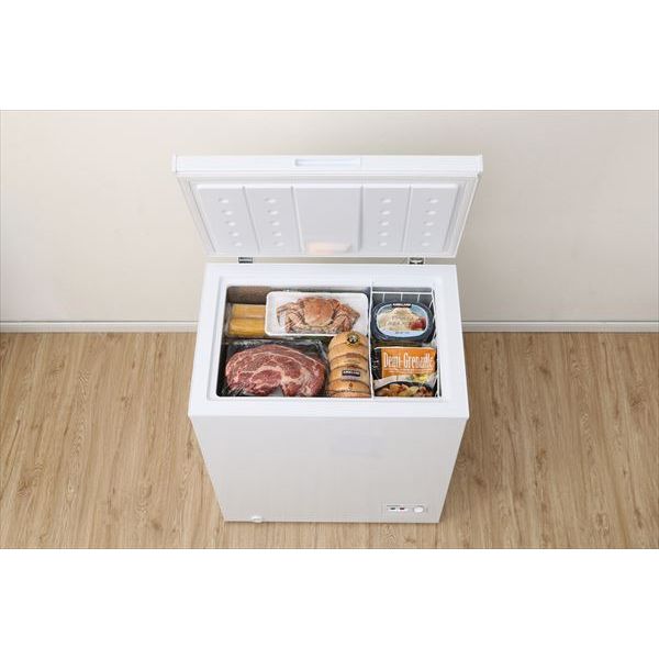 商品の説明パターン(種類):142L/上開き/ホワイト出し入れしやすい上開きタイプのノンフロン冷凍庫です。食品のまとめ買いにもピッタリ!ワイドな庫内で大容量。大きな魚やブロック肉も丸ごと冷凍できます。大容量の142L。下に溜まる冷気が逃げにくい上開き式です。高さと奥行を抑えたコンパクト&スリムデザインなので置く場所を選びません。食品の量に合わせて6段階の温度調節が可能です。LED庫内灯付きで、暗い場所でも食品を探しやすい。小物類が整理しやすい、便利なワイヤーバスケットつき。※霜が5mm以上ついたときは、霜取り作業を行ってください。